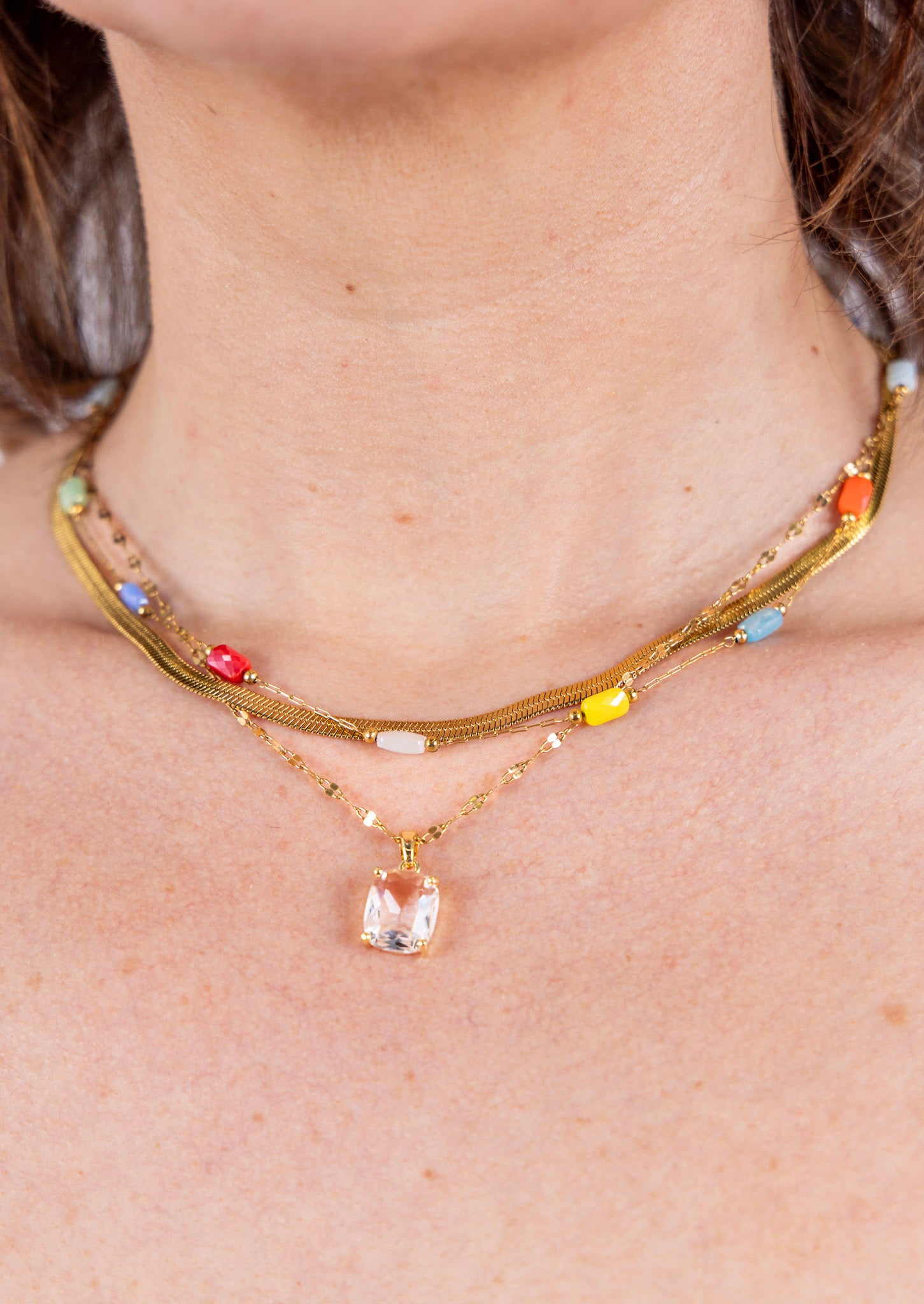 A timeless pendant necklace featuring a clear, faceted crystal set on a sleek silver-tone chain. Designed to catch the light beautifully, this waterproof necklace is made for everyday wear without tarnishing or fading. Elegant yet effortless, it’s perfect worn alone for a clean, classic look or layered with your favorite chains.